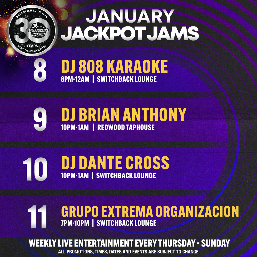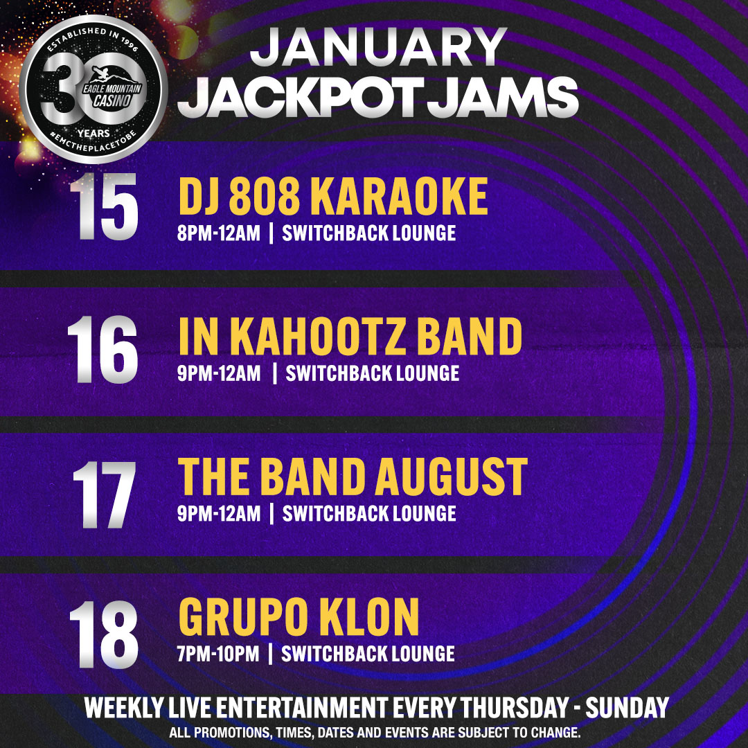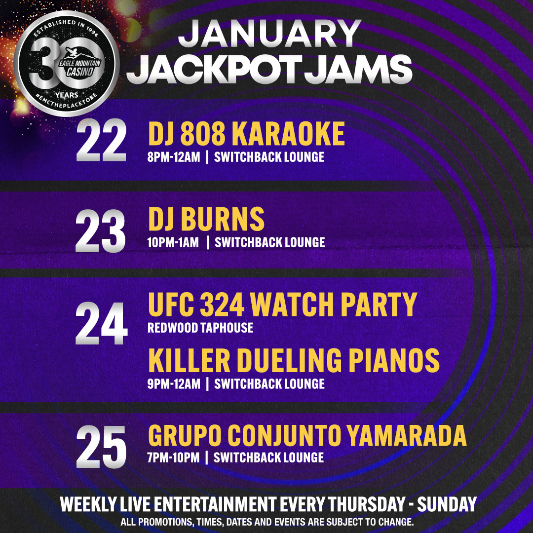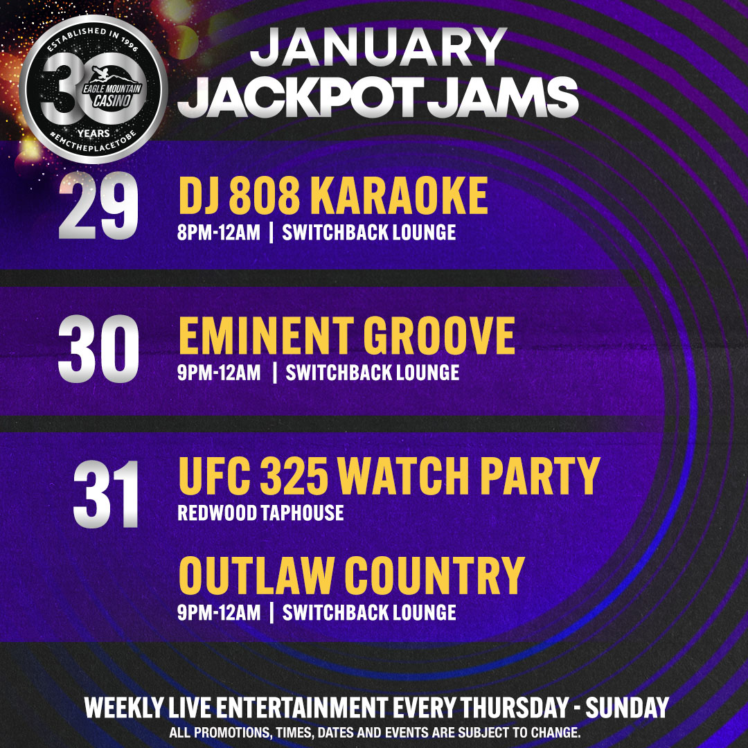 With our new 2000 seat state-of-the-art event center, you can enjoy top name entertainment just a short drive away. From live game shows to the best in comedy shows, and top music artists in country, Spanish, and classic R&B, you will not want to miss out on the fun and excitement. Come on down to Eagle Mountain Casino and experience the best entertainment!